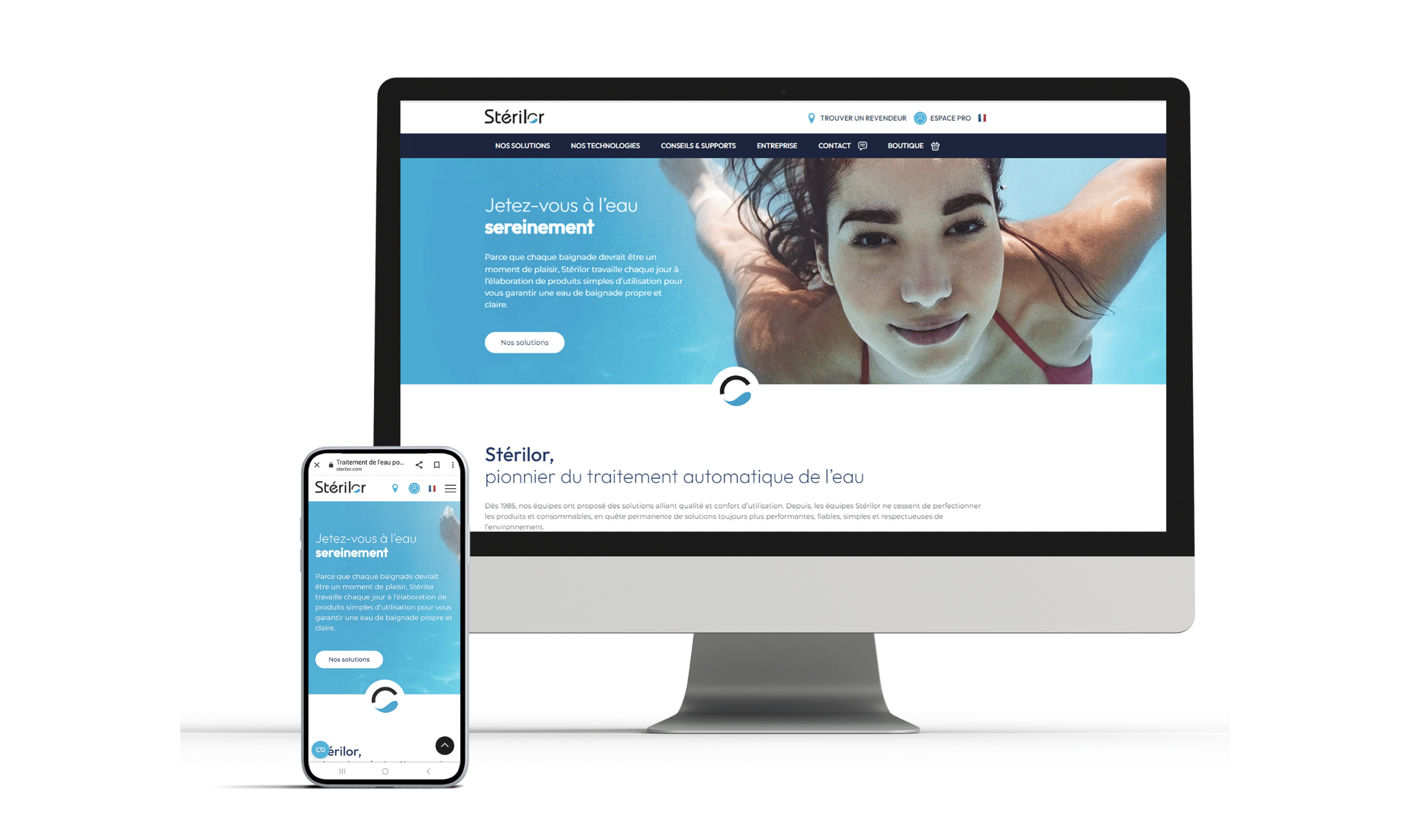 Avec son nouveau design, le site Stérilor invite son visiteur à se jetez sereinement à l’eau.